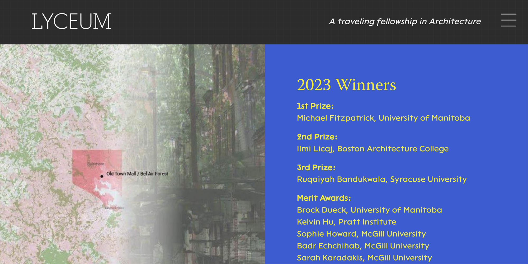 The Lyceum announces the 2023 winners of the traveling fellowship in architecture. The entries were based on the This design challenge was to consider redevelopment options for The Old Town Mall, the long abandoned outdoor pedestrian retail mall in the heart of Baltimore’s "Black Butterfly." Designers explored new programs for the site, study preservation vs. demolition options, evaluate public vs. private uses, and propose methods for engaging the community.