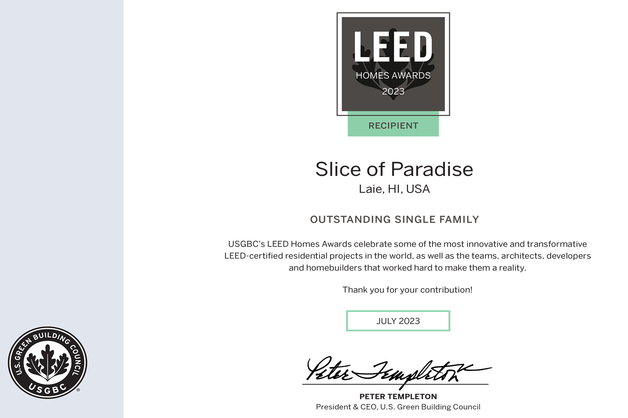 The U.S. Green Building Council (USGBC) has announced the recipients of its 2023 LEED Homes Awards, recognizing projects, developers, and home builders that have demonstrated leadership in the residential green building marketplace. MOKULUA High Performance Builder and Peter Vincent Architects Slice of Paradise was recognized as a 2023 LEED Outstanding Single Family Project. This Kahuku oceanfront residence is certified as LEED Platinum, Energy Star, and EPA Indoor AirPlus. The considerations for efficiency and durability were critical in the planning of this oceanside home, which experiences some of the harshest conditions on Oʻahu.