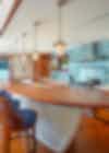 Hale Moku is a celebration of the home’s prominent, waterfront location adjacent to Koko Marina. Due to the owner’s love of boating, a modern “boat house” design theme emerged, intended to be both playful and sophisticated. The house’s material and color palette was fashioned after vintage Chris-Craft boats. Nautical light fixtures add appropriate detail for effect throughout, and the use of ocean colored glass tiles expand the sense of view and lighten and brighten otherwise dark spaces. The house’s central great room ceiling was raised to create a curved ceiling like that of a boat hull. The marina-facing wall was completely opened.