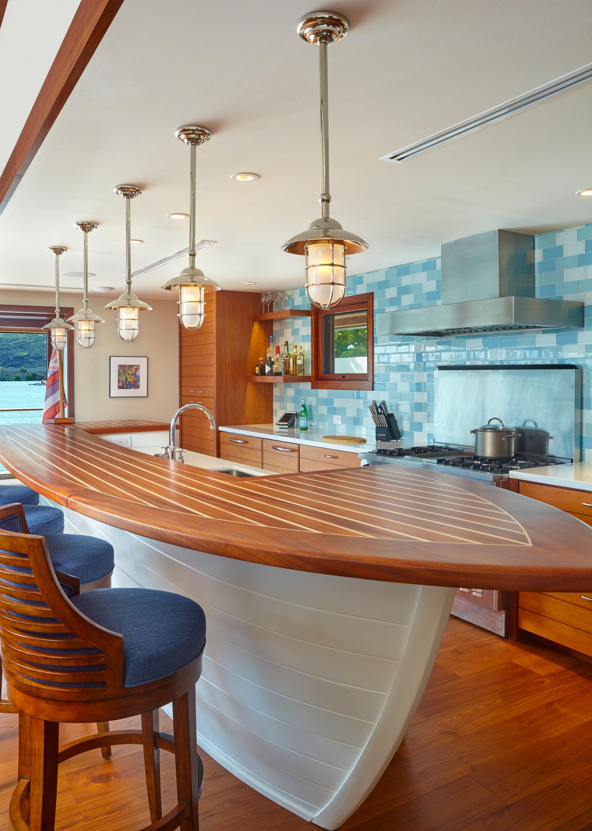 Hale Moku is a celebration of the home’s prominent, waterfront location adjacent to Koko Marina. Due to the owner’s love of boating, a modern “boat house” design theme emerged, intended to be both playful and sophisticated. The house’s material and color palette was fashioned after vintage Chris-Craft boats. Nautical light fixtures add appropriate detail for effect throughout, and the use of ocean colored glass tiles expand the sense of view and lighten and brighten otherwise dark spaces. The house’s central great room ceiling was raised to create a curved ceiling like that of a boat hull. The marina-facing wall was completely opened.