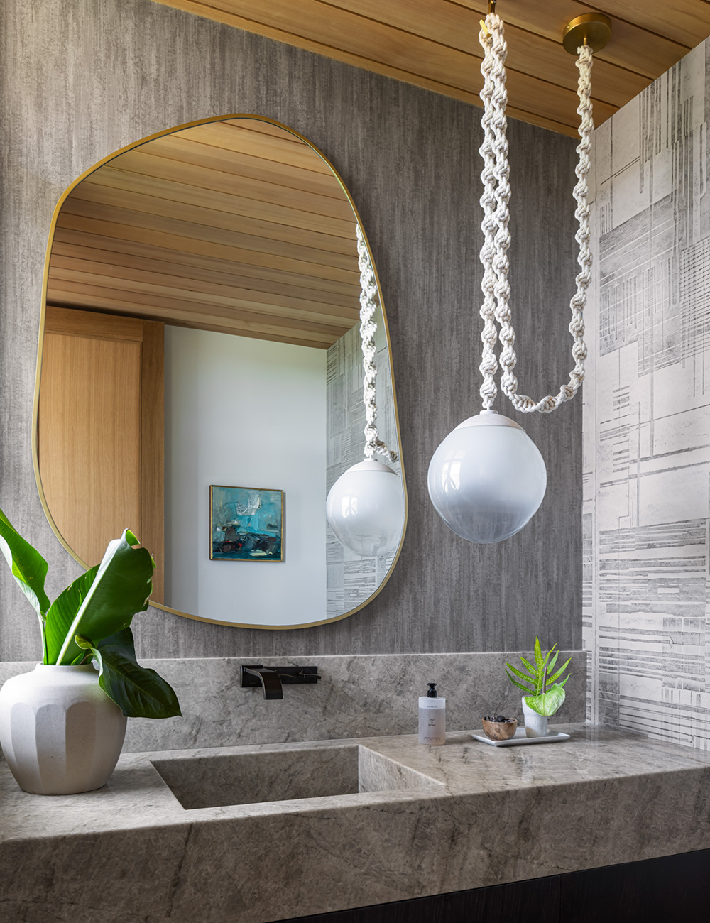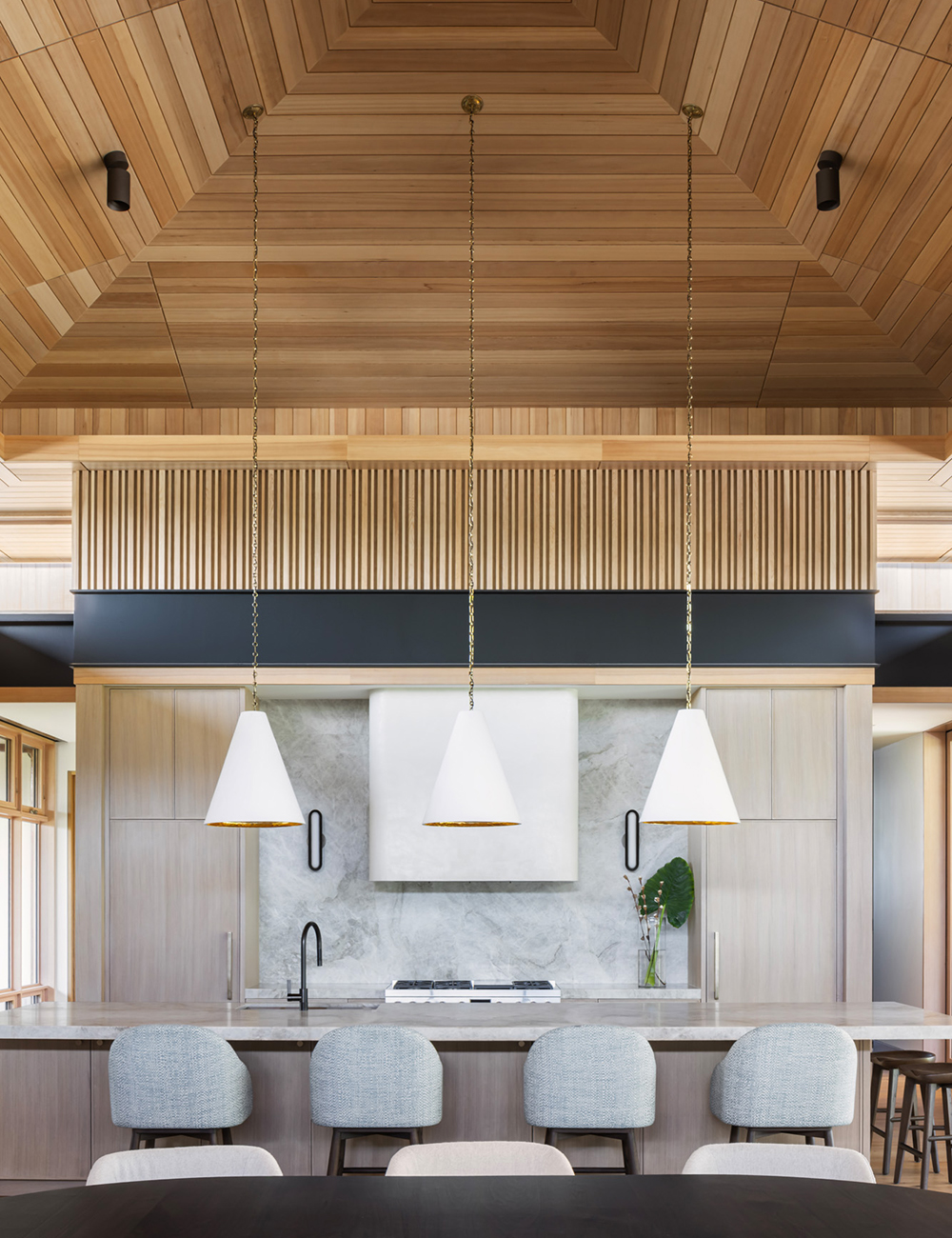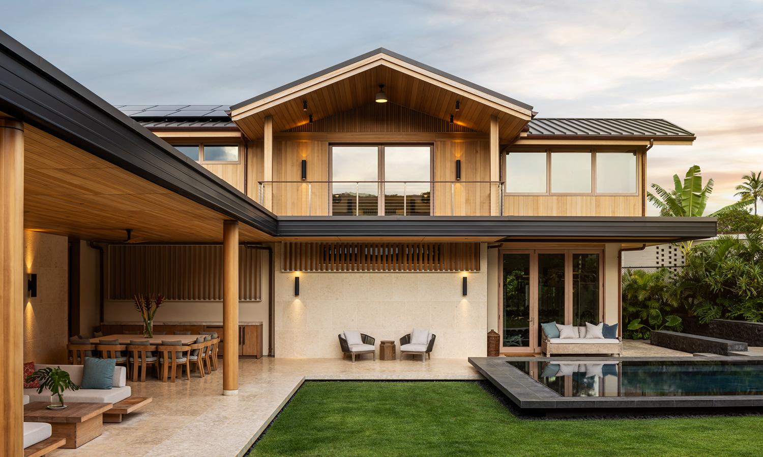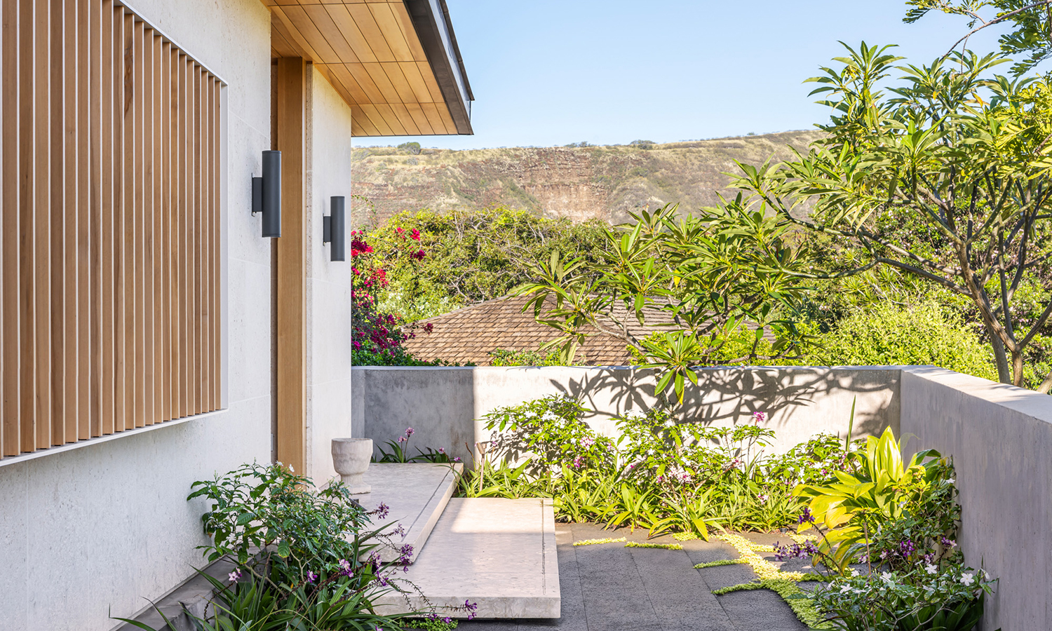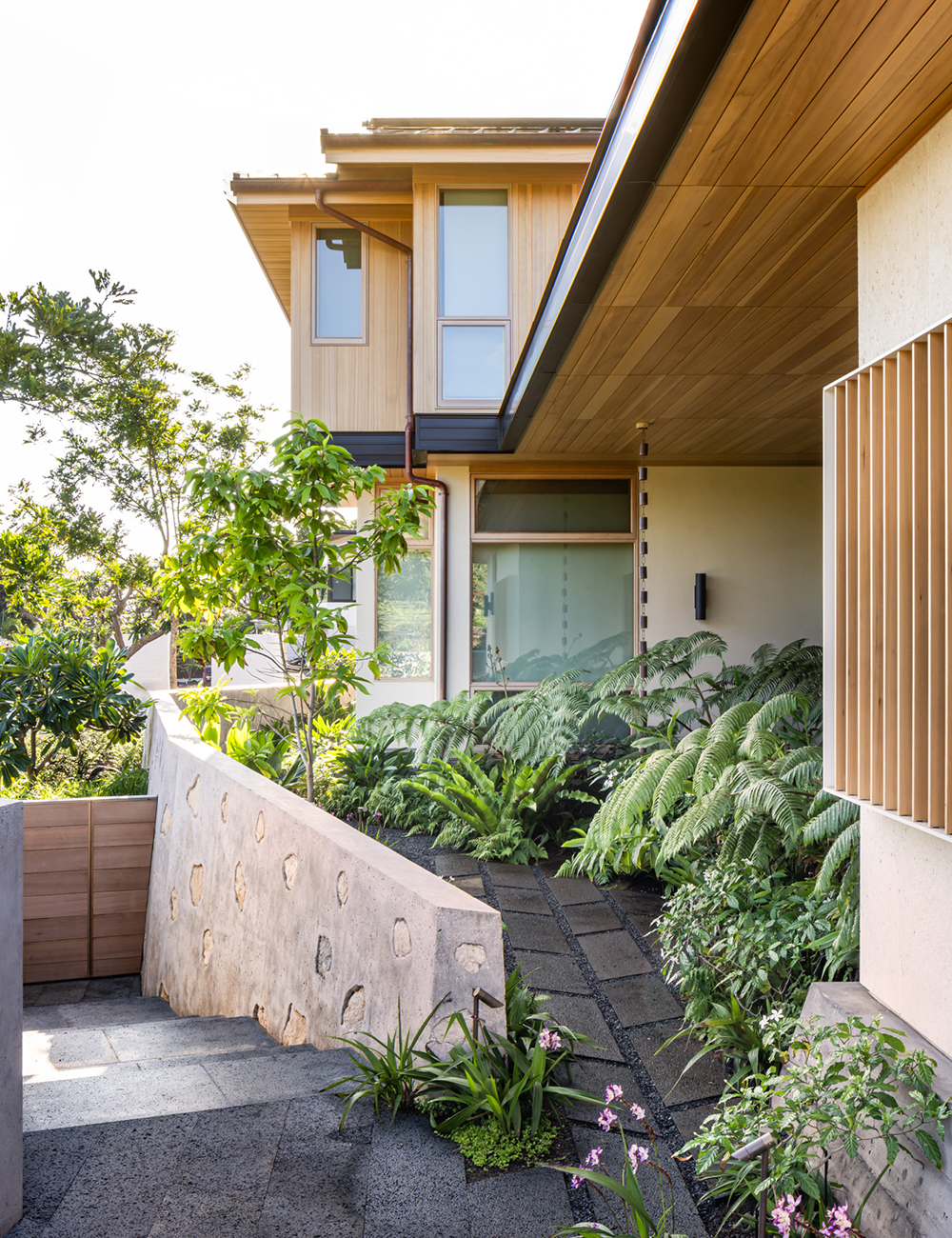 Hale Lē‘ahi home offers a contemporary interpretation of mid-century modern Hawaiian residential design, drawing inspiration from Ossipoff’s Pauling House. Oriented to embrace an outdoor garden anchored by a 150-year-old Banyan tree, the design also captures sweeping views of Diamond Head. A casual yet refined aesthetic is achieved through a loose rock base evoking the natural scatter of volcanic stone and a concrete wall embedded with coral excavated from the site. This grounded base transitions gracefully to the street, creating a level plane for both house and garden. Above the great room, a floating roof forms a light, airy gathering space that promotes natural ventilation and reduces heat gain.