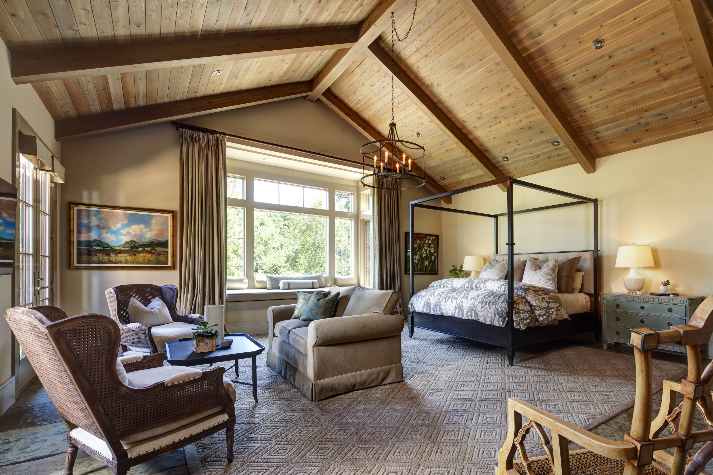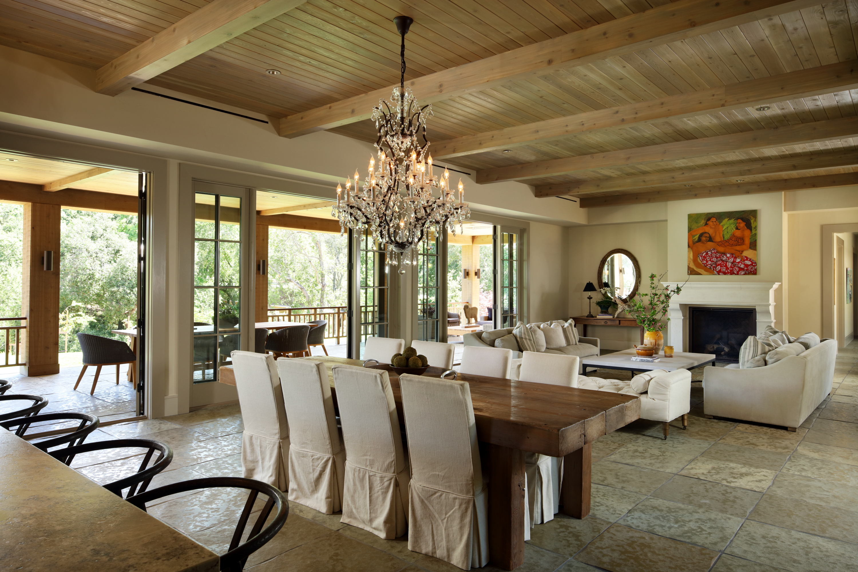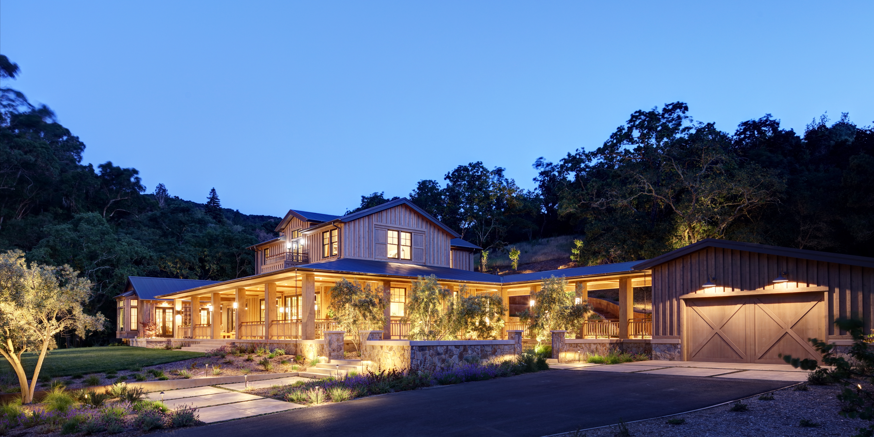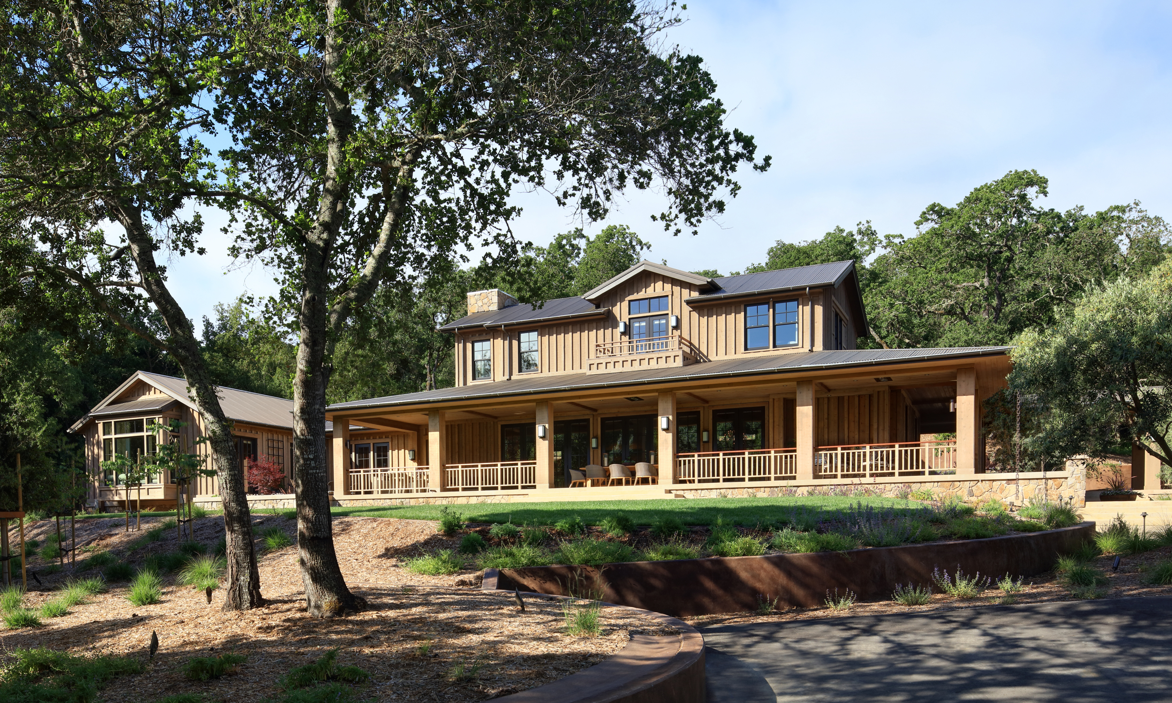 The design pays homage to the site’s rustic heritage, yet has clean, contemporary lines and a sense of casual understated elegance. The siting preserves many of the site’s majestic oak trees and the curving dirt access road and bridge that crossed a stream – one of the site’s unique features. Materials selected reflect a simple farmhouse aesthetic and a detached garage references the site’s old barn and is connected by a covered walkway, serving as an extension of the porch.