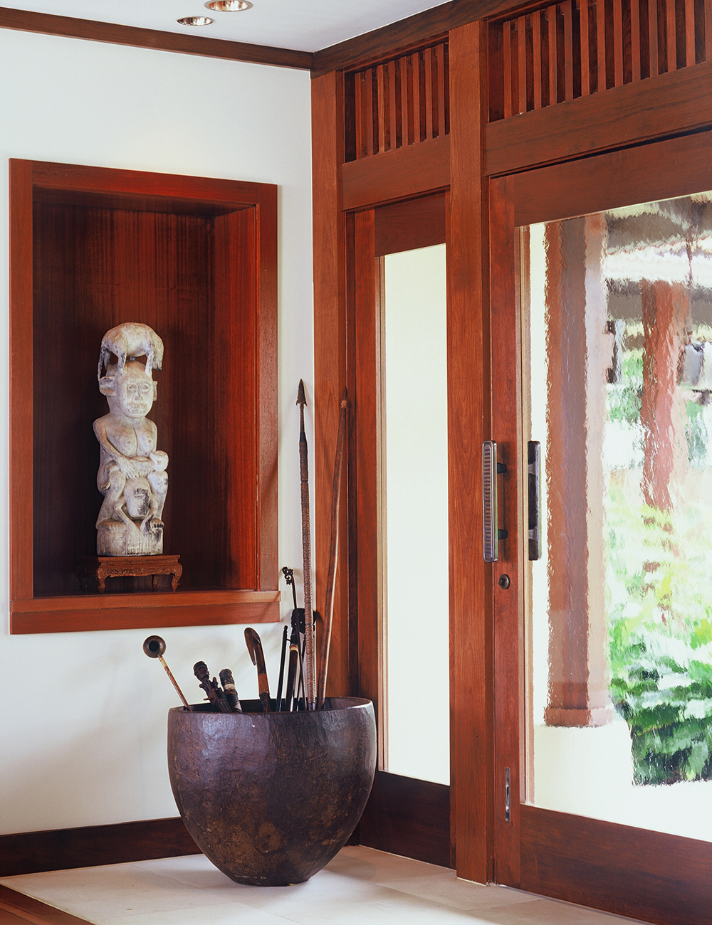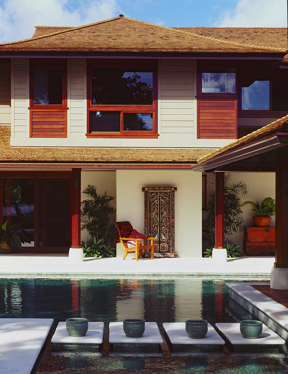At the heart of the design is the "village" concept, where distinct structures are connected by covered walkways and lanais. The entry pavilion, featuring authentic Balinese doors and carved panels, sets the tone for the home’s rich cultural influences. Water is a unifying element throughout, from the re-landscaped natural spring-fed pond to the infinity-edge pool with floating stone steps leading to a serene poolside pavilion.
