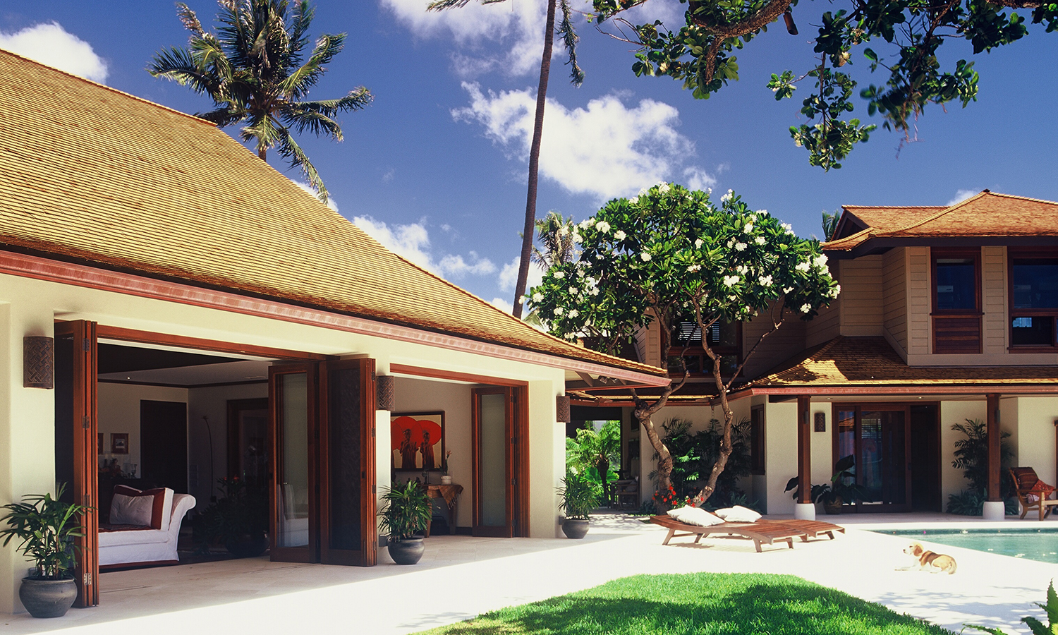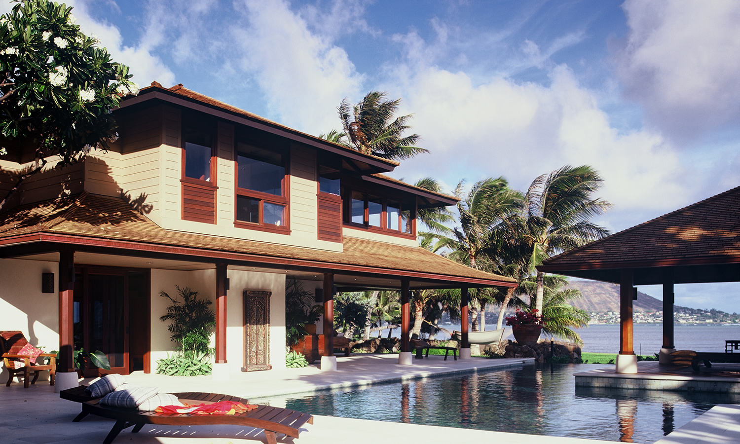 Maunalua Bay Estate is a tropical retreat that seamlessly blends Balinese influences with Hawaiian sensibilities, creating an open, tranquil living experience. Inspired by the owners' years in Indonesia, the estate is designed as a series of interconnected pavilions that embrace the natural landscape while providing modern comforts. The home takes full advantage of its unique trapezoidal oceanfront lot, maximizing panoramic views while maintaining privacy and tranquility.