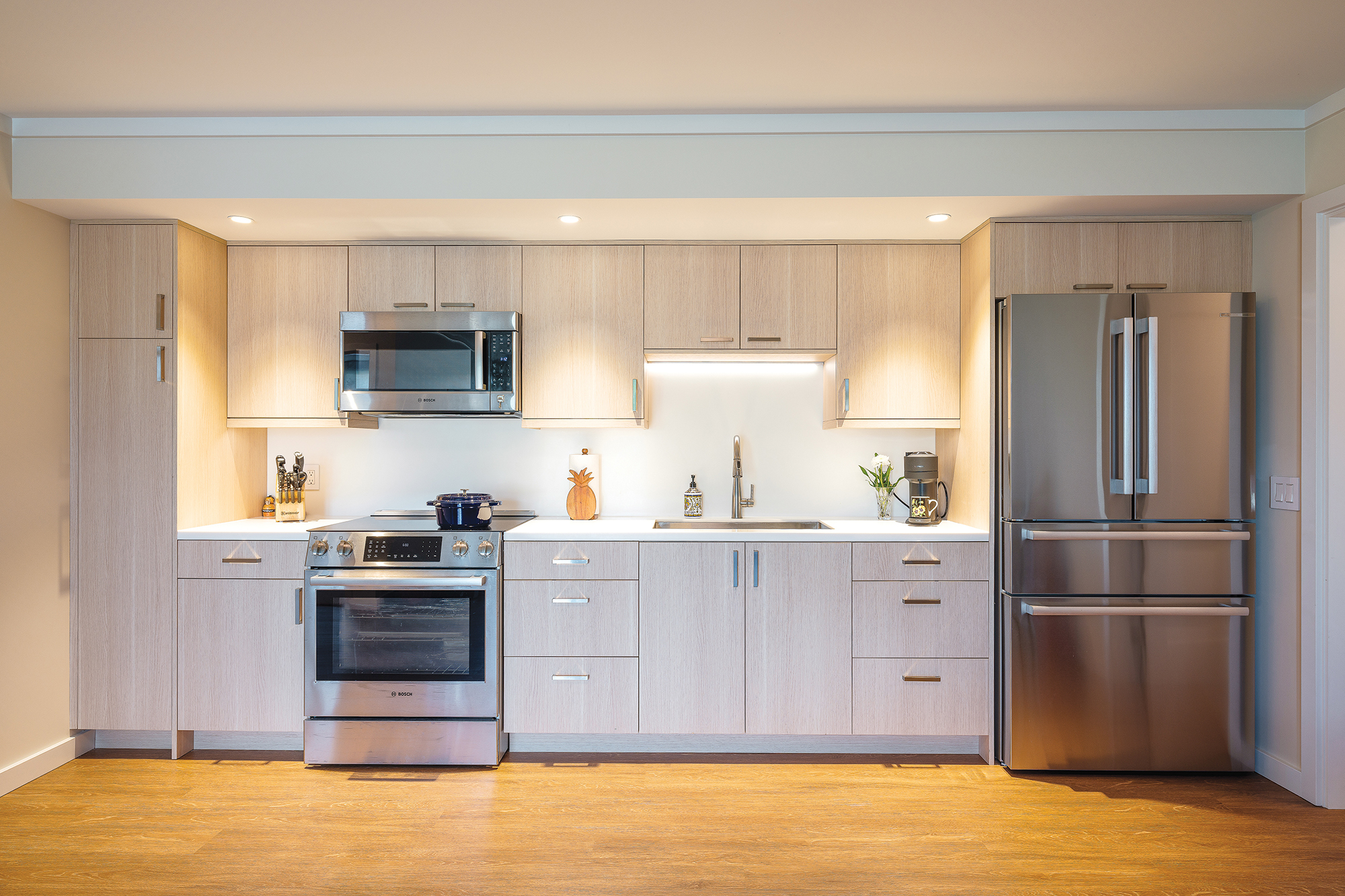 The design is a clean, contemporary style with five bedrooms and three bathrooms on the main floor and an accessory dwelling unit and garage at street level. The home is designed around family and entertaining with indoor-outdoor living spaces that encourage energy efficiency. The main floor focuses on the kitchen as a gathering space with plenty of storage and unobstructed views.
