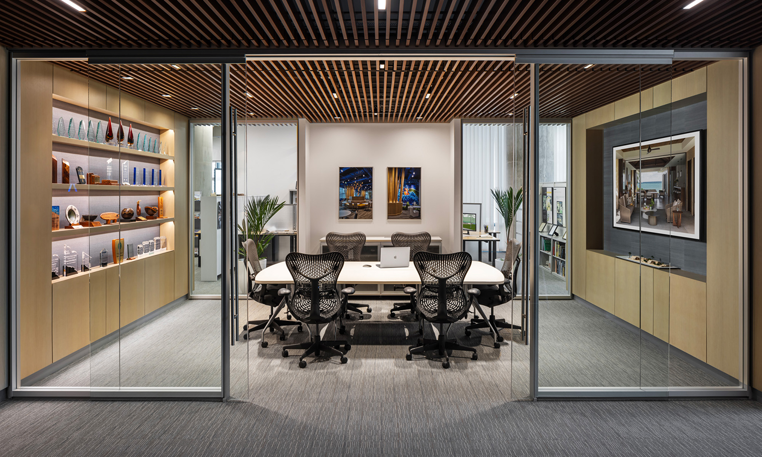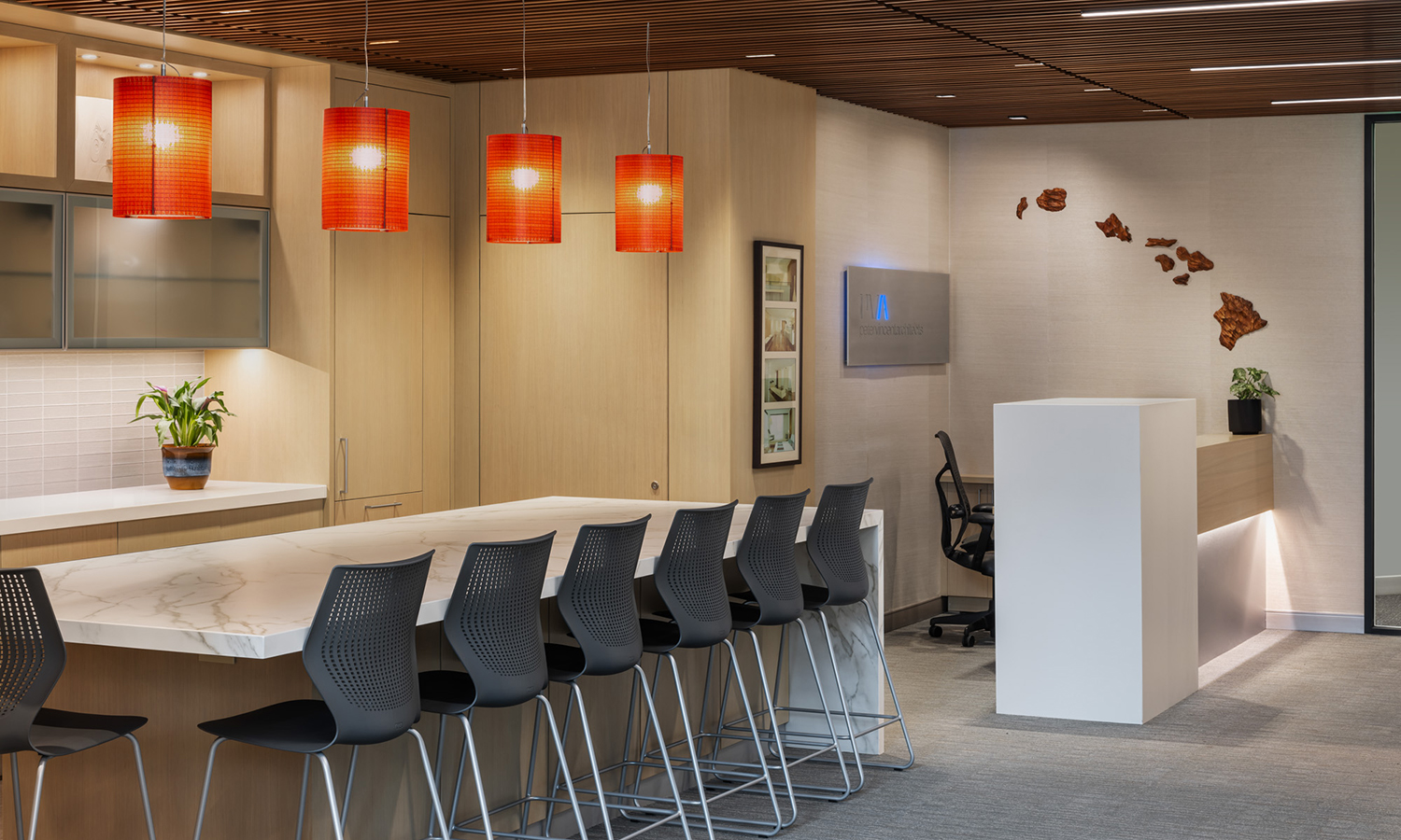 The layout provides areas for collaboration while providing a visual connection throughout the office. A suspended wooden trellis creates a more intimate feel and a contrasting release when entering the open studio with 19ʻ tall ceilings. The entry area transitions into a multifunctional kitchen for entertaining and a state-of-the-art conference room surrounded by glass allows light to permeate deep into the space while providing a sense of privacy. The interiors library became a visual element in the design instead of serving as storage. Breakout spaces and low dividers create an office that is communicative, collaborative, and inviting.